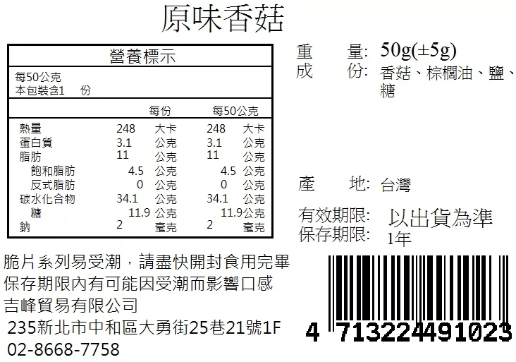 3.商品重(容)量:菇菇酥-原味香菇50g/包