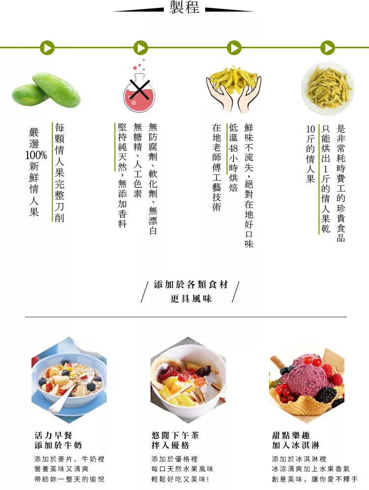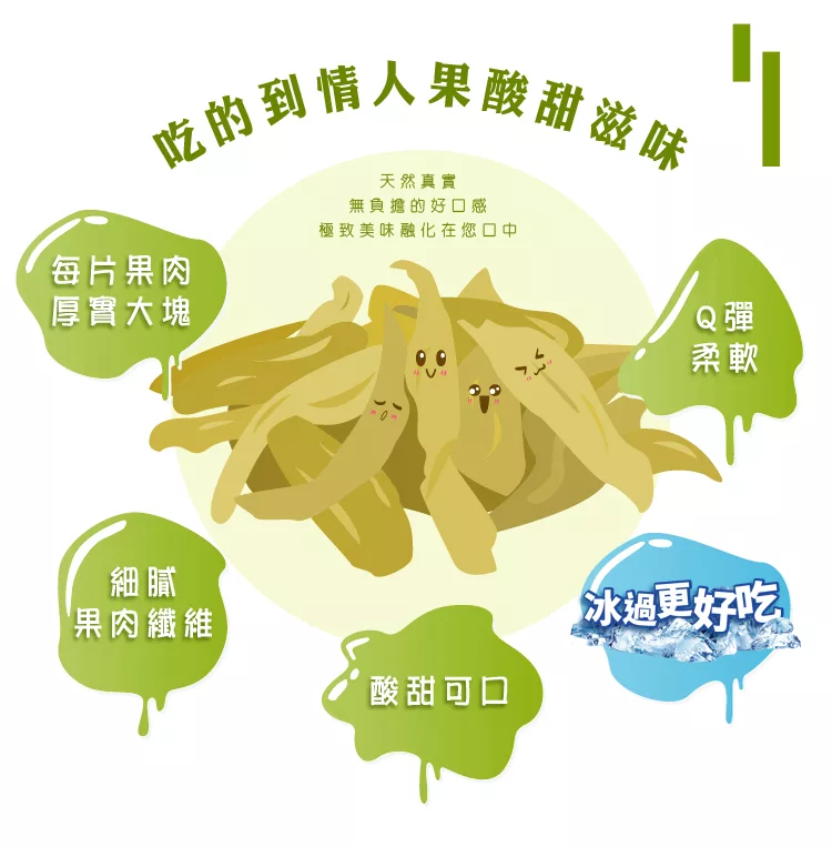 注意:1歲以下不宜食用,果乾表面若有白色結晶或顏色較深為糖分自然滲透現象,請安心食用。