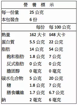 過敏原資訊:本產品含堅果。本生產線亦生產含牛奶製品、芝麻、含麩質之穀類、大豆及種子類的產品。