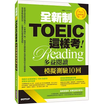 | Dr. TOEIC多益教授的全新制多益單字+片語+句型(附1CD+防水書套) | 全新制TOEIC這樣考:多益閱讀模擬測驗10回 |
