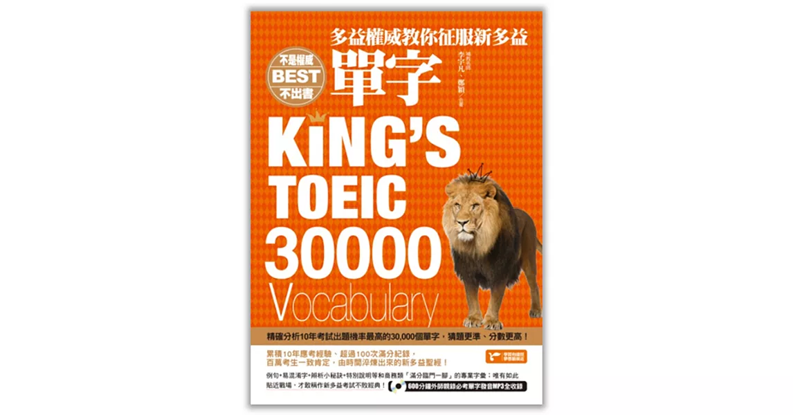 權威高手根據近十年的應考經驗,挑出多益考試一定要記熟的30,000單字。想拿滿分,就別做「只背1,200單字就能拿高分」這種不切實際的夢!方法用對,單字再多都能記得滾瓜爛熟,滿分自然手到擒來!