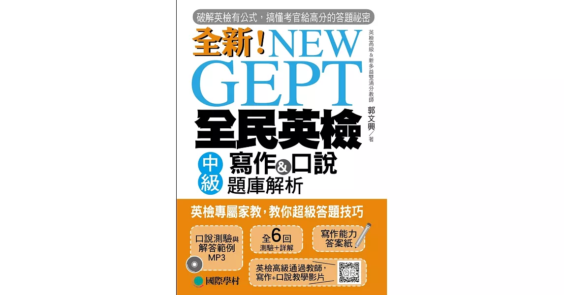 你在找博客來-NEW GEPT 全新全民英檢中級寫作&口說題庫解析:英檢高級、新多益雙滿分名師,教你超級答題技巧!(附口說測驗MP3+教學影片QR碼)哪裡買嗎?