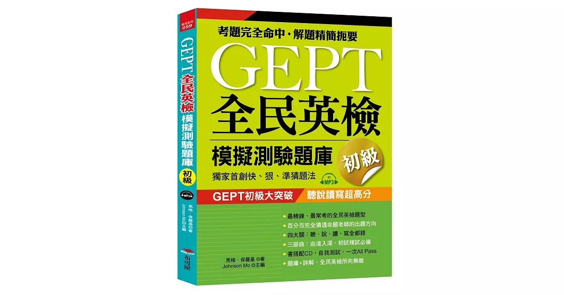 博客來-GEPT全民英檢模擬測驗題庫初級(初試複試):獨家首創快、狠、準猜題法(附MP3)訂購網址: https://www.books.com.tw/exep/assp.php/87926/products/0010816345?utm_source=87926&utm_medium=ap-books&utm_content=recommend&utm_campaign=ap-201906