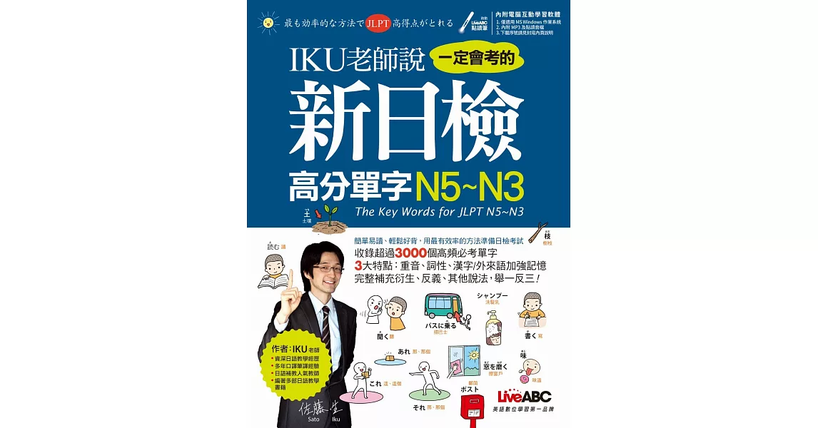 博客來-IKU老師說一定會考的新日檢高分單字N5~N3:【1書+1片DVD-ROM 數位學習光碟(含朗讀MP3)】(數位點讀版)訂購網址: https://www.books.com.tw/exep/assp.php/87926/products/0010827796?utm_source=87926&utm_medium=ap-books&utm_content=recommend&utm_campaign=ap-201906