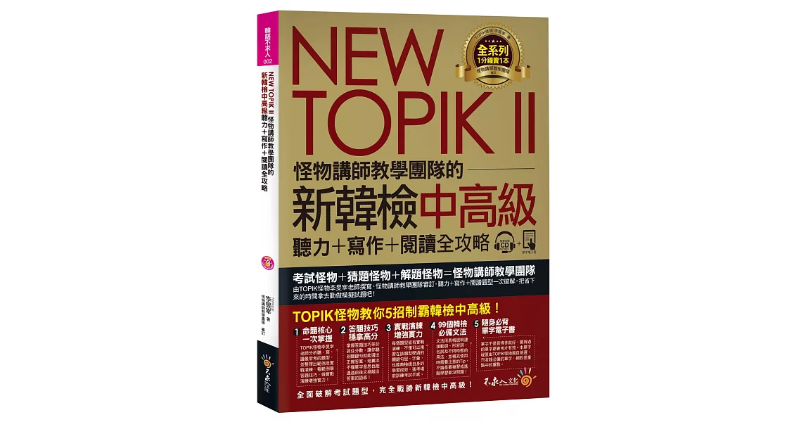 博客來-NEW TOPIK II怪物講師教學團隊的新韓檢中高級聽力+寫作+閱讀全攻略(附1CD+TOPIK II必備單字電子書+防水書套)訂購網址: https://www.books.com.tw/exep/assp.php/87926/products/0010829493?utm_source=87926&utm_medium=ap-books&utm_content=recommend&utm_campaign=ap-201906