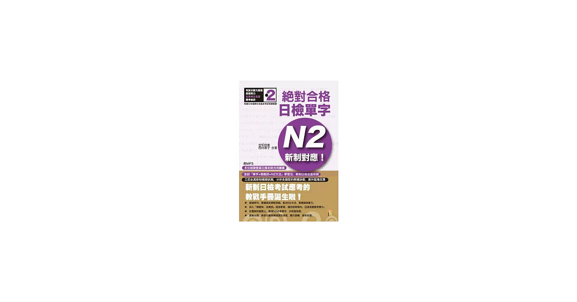 配合新制日檢,史上最強的日檢N2單字集《新制對應 絕對合格!日檢單字N2》,是根據日本國際交流基金(JAPAN FOUNDATION)舊制考試基準及新發表的「新日本語能力試驗相關概要」,加以編寫彙整而成的。