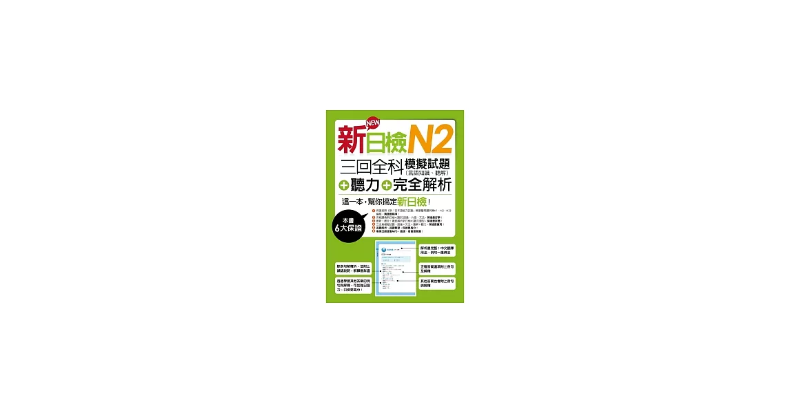 6. 聽力王─應考力全面提升:強調「活用」概念的新制日檢考試,把聽力的分數提高了。為此,書中還附贈光碟,幫助您熟悉日語語調及正常速度。建議大家充分利用生活中一切零碎的時間,反覆多聽,在密集的刺激下,把單字、文法、生活例句聽熟,同時為聽力打下了堅實的基礎。