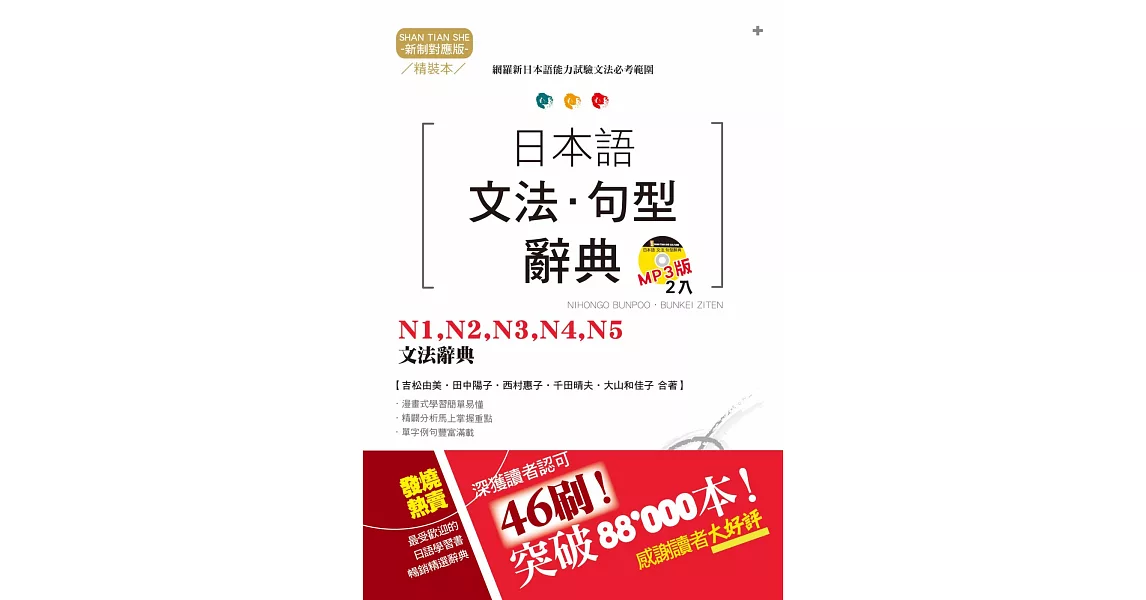博客來-精裝本 新制對應版 日本語文法句型辭典:N1,N2,N3,N4,N5文法辭典(25K+2MP3)訂購網址: https://www.books.com.tw/exep/assp.php/87926/products/0010670482?utm_source=87926&utm_medium=ap-books&utm_content=recommend&utm_campaign=ap-201906
