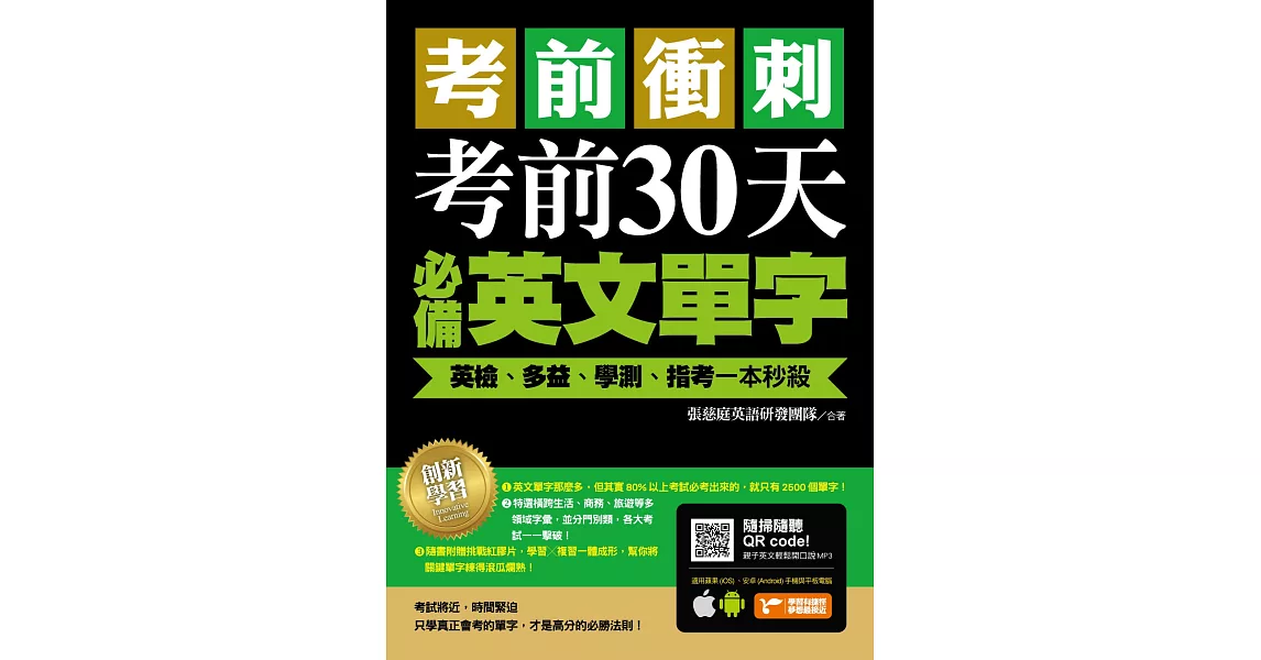 →→→→更多詳細”考前衝刺,考前30天必備英文單字:英檢、多益、學測、指考一本秒殺(附隨掃隨聽QR code)”介紹請點我