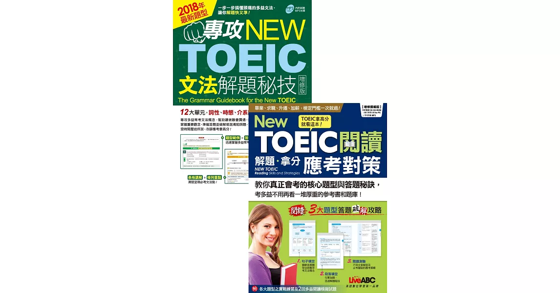 博客來-專攻NEW TOEIC解題秘技(文法+閱讀)【博客來獨家套書】:【書+1片朗讀MP3光碟+1片電腦互動光碟】訂購網址: https://www.books.com.tw/exep/assp.php/87926/products/0010812687?utm_source=87926&utm_medium=ap-books&utm_content=recommend&utm_campaign=ap-201906