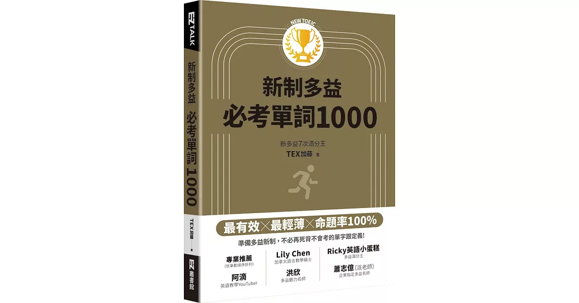 商品描述: 書名:New TOEIC新制多益必考單詞1000(QR code + mp3 雙音檔,附遮色片),原文名稱:TOEIC L & R TEST 出る単特急 金のフレーズ,語言:繁體中文,ISBN:9789862487907,頁數:288,出版社:EZ叢書館,作者:TEX加藤,譯者:劉建池,出版日期:2019/01/31,類別:語言學習