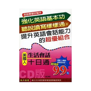 本書是以美國人的日常生活為架構而編排的實用會話指南,介紹各種日常生活對話句型,列出常用的字彙和片語,附學習重點注解;書後並附演練題型,另附CD2片幫助讀者正確、靈活的運用於會話中。