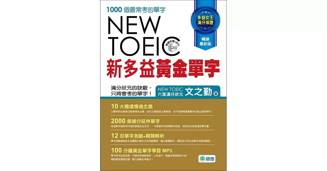 博客來-新多益黃金單字(附12回單字測驗+精闢解析+MP3) 【暢銷最新版】訂購網址: https://www.books.com.tw/exep/assp.php/87926/products/0010798287?utm_source=87926&utm_medium=ap-books&utm_content=recommend&utm_campaign=ap-201906