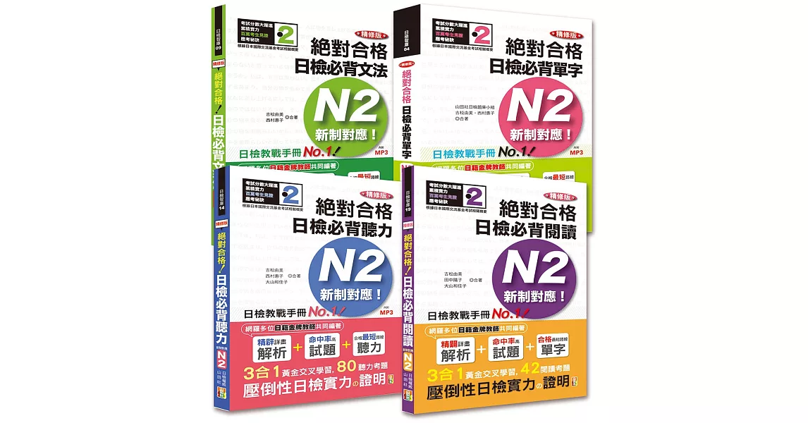 博客來-日檢N2套書:精修版 新制對應 絕對合格!日檢必背 [單字,文法,閱讀,聽力] N2熱銷套書(25K+MP3)訂購網址: https://www.books.com.tw/exep/assp.php/87926/products/0010799622?utm_source=87926&utm_medium=ap-books&utm_content=recommend&utm_campaign=ap-201906