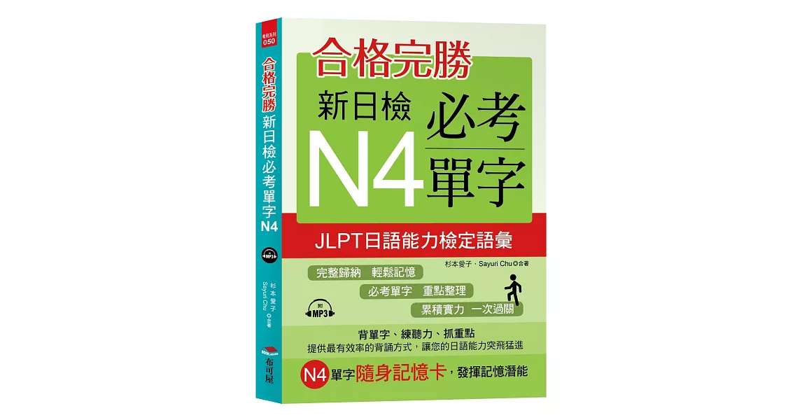 商品描述: 書名:合格完勝:新日檢必考單字N4 (附MP3),語言:繁體中文,ISBN:9789869660129,頁數:240,出版社:布可屋,作者:杉本愛子,Sayuri Chu,出版日期:2018/09/05,類別:語言學習