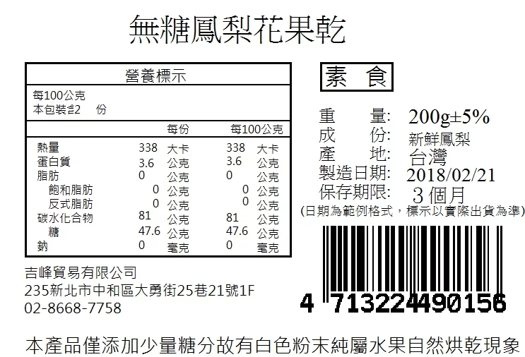 商品描述: 【午後小食光】無糖鳳梨花果乾(200g±5%/包)