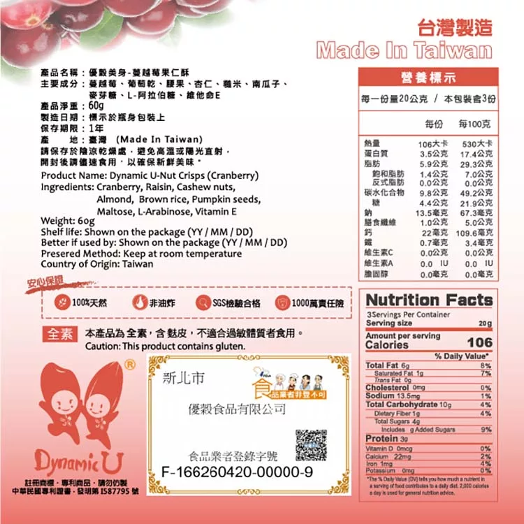 商品說明: 【優穀美身】蔓越莓果仁酥 (60g袋裝)