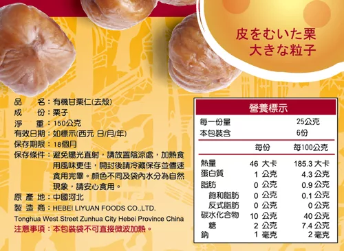商品描述: 【康健生機】有機甘栗仁3入組(150g/包)