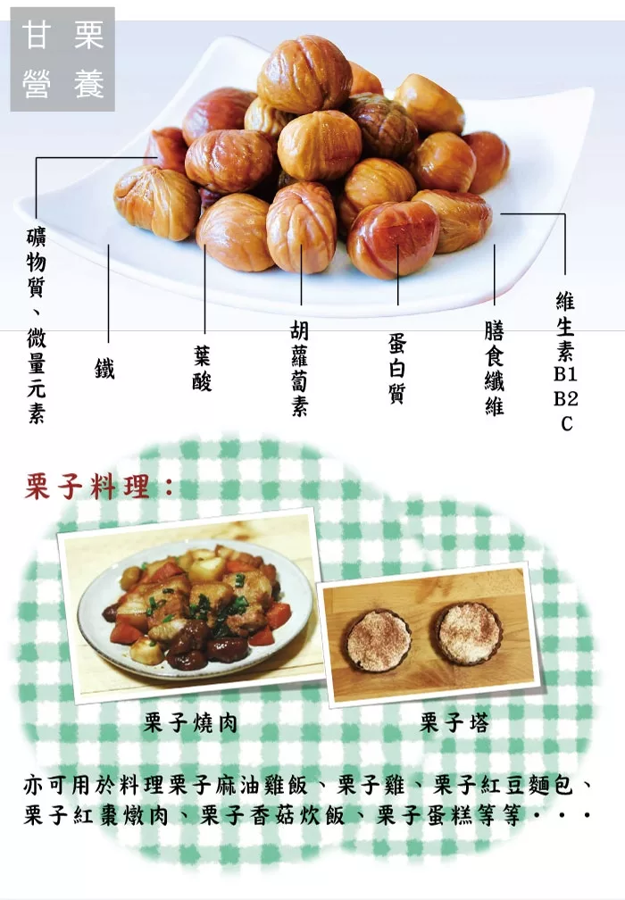 中國人食栗子的花式很多,除了直接食用之外, 還可以清燉香菇栗子雞、栗子炊飯、栗子蛋糕甜點或是煮咖哩雞時將馬鈴薯換成栗子,都別有一番風味。