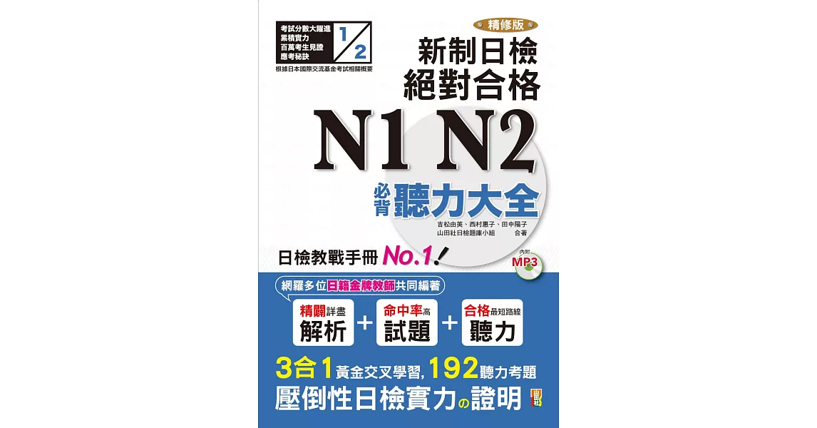 博客來-精修版 新制日檢!絕對合格N1,N2必背聽力大全(25K+MP3)訂購網址: https://www.books.com.tw/exep/assp.php/87926/products/0010780493?utm_source=87926&utm_medium=ap-books&utm_content=recommend&utm_campaign=ap-201906